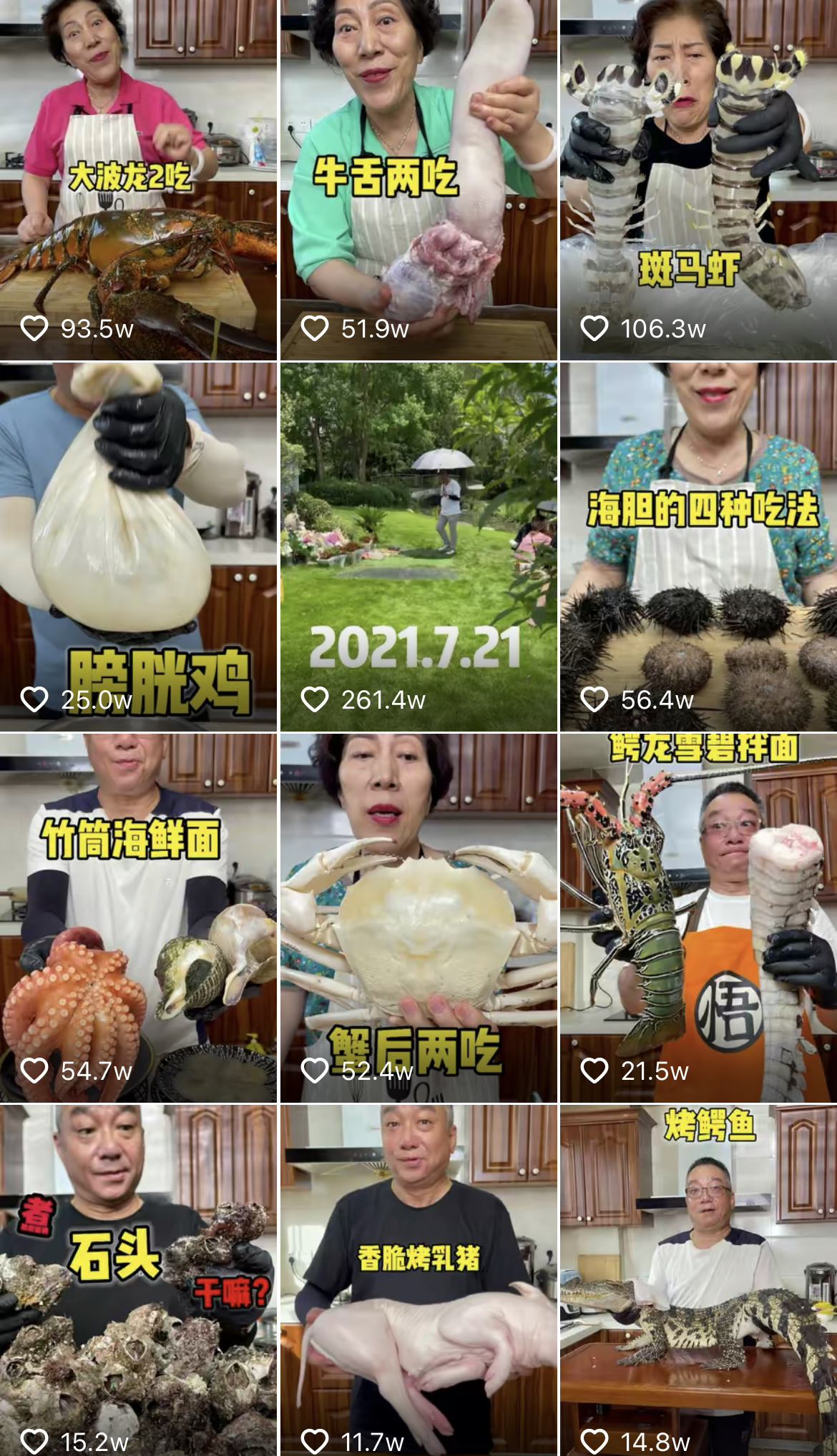 在短視頻平臺可以看到,喬任梁的父母以“高彩萍和喬老爺”這一賬號分享生活日常,其中多是美食視頻,如土耳其烤肉、椰子蟹、烤乳豬等等,食材五花八門。