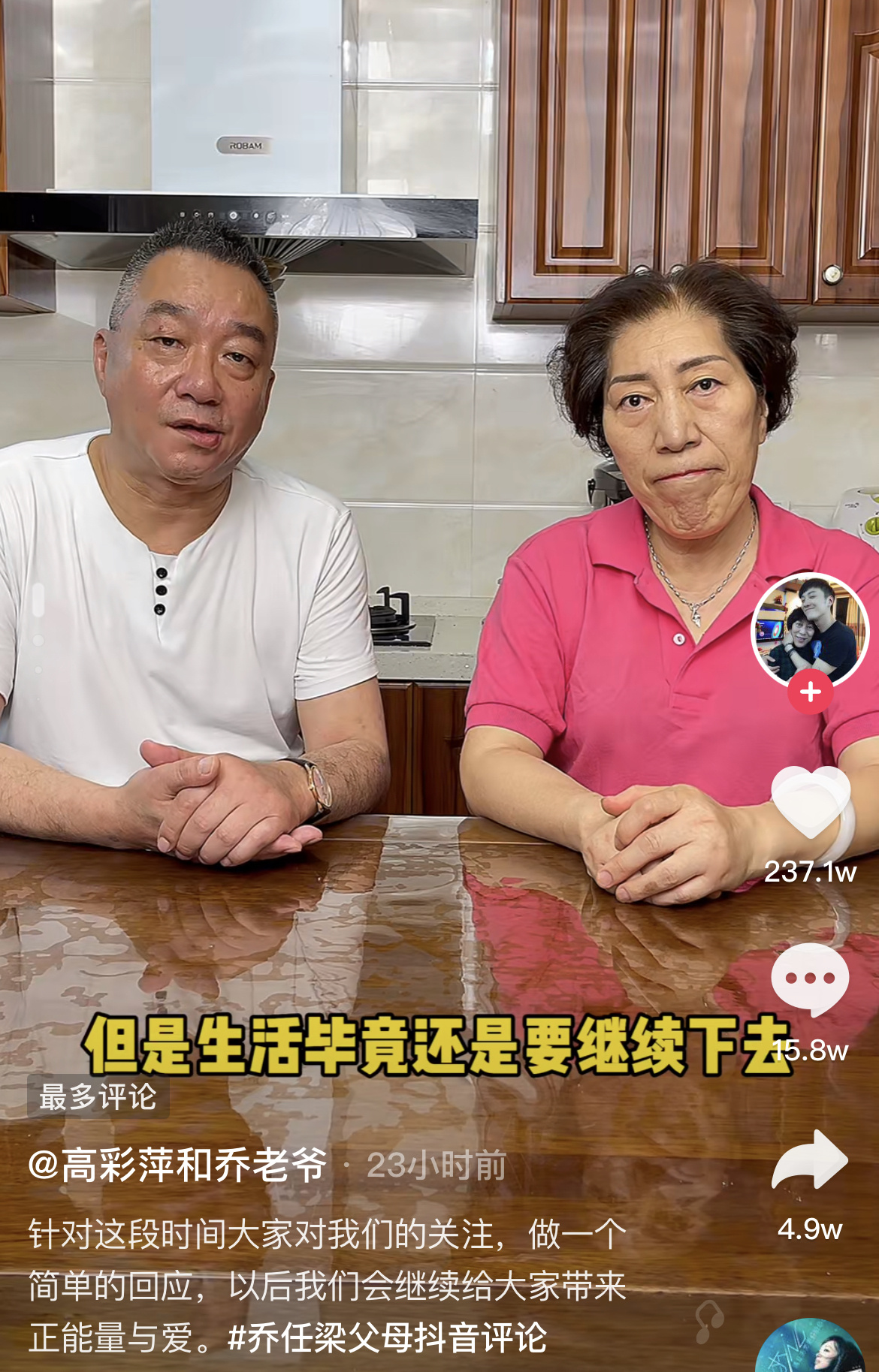 類似聲音越來越多,在網上引發關注。23日,喬任梁父母對此做出回應。在視頻中,他們解釋了做短視頻的原因,一是想給兒子粉絲分享生活近況,二是想把兒子的品牌延續下去。同時也把生活中美好的一面展現給大家,給更多的失獨家庭和抑郁癥患者做個榜樣。