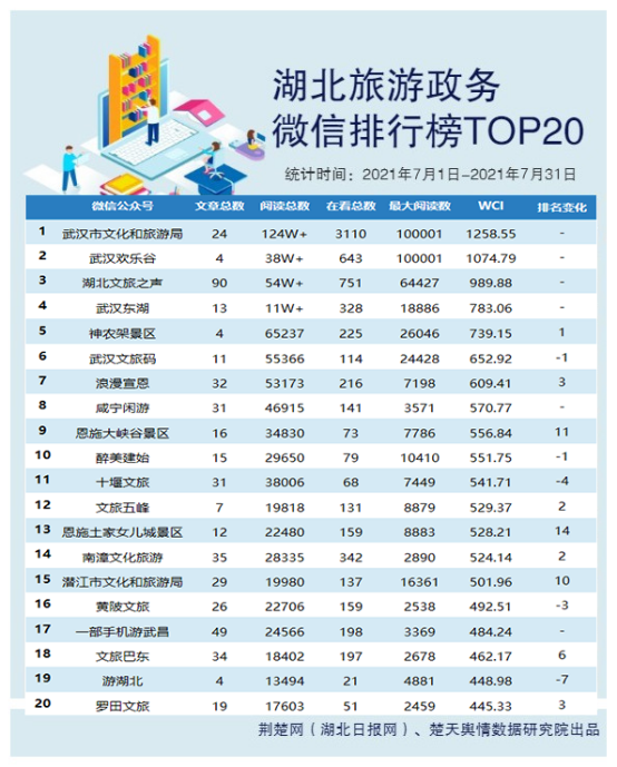 7月,夏日火辣辣的天氣讓親水活動成為旅游新聞的主角。8月25日,由荊楚網(湖北日報網)、楚天輿情數據研究院制作的7月旅游行業政務微信榜單發布,“武漢市文化和旅游局”WCI指數蟬聯榜首,“武漢歡樂谷”和“湖北文旅之聲”保持上期排位,分別位居第二和第三,7月原創文章排行榜前20名由“武漢市文化和旅游局”獨占的局面被打破,“神農架景區”和“武漢文旅碼”各有一篇入榜。