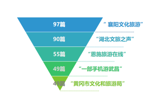 從文章發布總數來看,整體數值與6月相比下降明顯。“襄陽文化旅游”“湖北文旅之聲”“恩施旅游在線”“一部手機游武昌”和“黃岡市文化和旅游局”依次以97篇、90篇、55篇、49篇和52篇次排名前五,其中,“襄陽文化旅游”蟬聯第一。