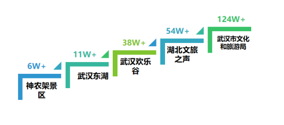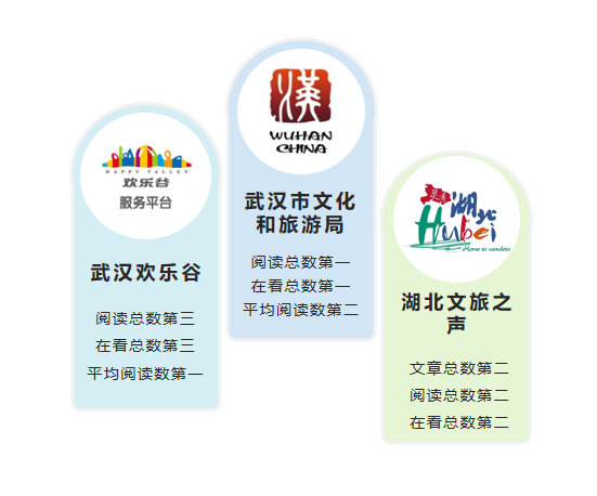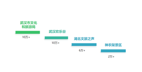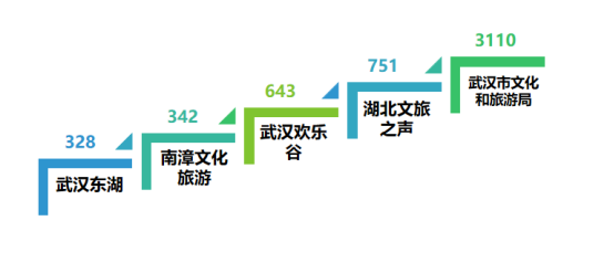 從文章閱讀總數來看,本期閱讀量小幅下降,“武漢市文化和旅游局”該項指標為124萬+,較6月減少了26萬+;“湖北文旅之聲”為54萬+,較上月增加13萬+;“武漢歡樂谷”本期閱讀量38萬+(上期33萬+),“武漢東湖”本期閱讀量11萬+(上期11萬+)。總的來說,本期前四名都超過10萬,第五名“神農架景區”不到10萬,這和上期基本一致。