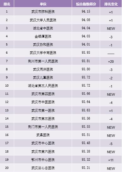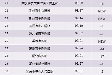 本階段,榜單變動較大,武漢市肺科醫(yī)院取得冠軍寶座;湖北省人民醫(yī)院較上月排名上升一位,位居榜眼,湖北省中醫(yī)院作為新晉醫(yī)院表現(xiàn)優(yōu)秀躋身前三甲。新晉9家單位中,武漢市第四醫(yī)院、荊門市第一人民醫(yī)院、武昌醫(yī)院、武漢市第六醫(yī)院、武漢亞心總醫(yī)院進入前20名。排名變動在10位以上的單位有2家,荊州市第一人民醫(yī)院上升20位,荊州市第一人民醫(yī)院上升11位。武漢科技大學(xué)附屬天佑醫(yī)院、武漢市第一醫(yī)院排位分別上升8位和1位。遺憾的是,湖北省婦幼和襄陽市中醫(yī)醫(yī)院分別下降17位和14位,溯源發(fā)現(xiàn),排名下滑主因為媒體報道量減少,后續(xù)可從醫(yī)院治療案例等方面加強宣傳力度,后期仍有較大上升空間。