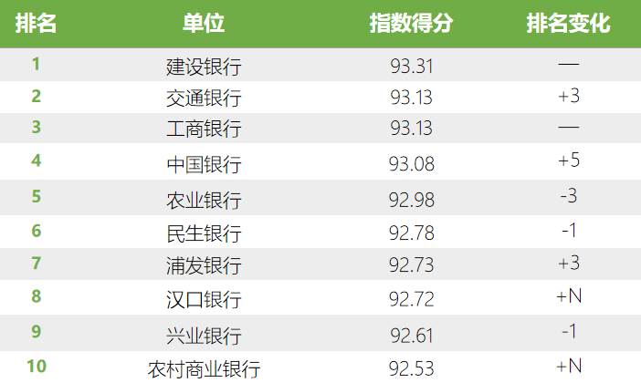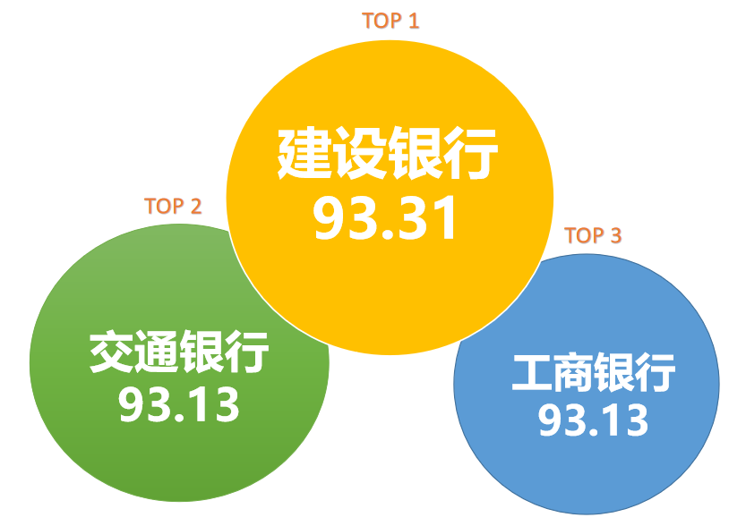 本期前三甲中,建設銀行連續第三期蟬聯榜首位置,交通銀行上升3位與工商銀行并列第二三位。觀察TOP10榜單可見,本期榜單整體成績較上期有所下滑,除建設銀行和工商銀行外,各家銀行排名情況均有不同程度變化,漢口銀行、農村商業銀行再登TOP10榜單,中國銀行、交通銀行、浦發銀行排名上升,招商銀行、農業發展銀行掉出榜單。
