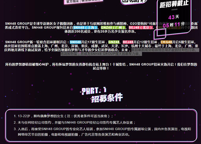 以女子偶像團體SNH48 GROUP聞名的絲芭集團近日發布招募信息,要求報名者為13-22歲、擁有偶像夢想的女生(優秀者條件可適當放寬)。