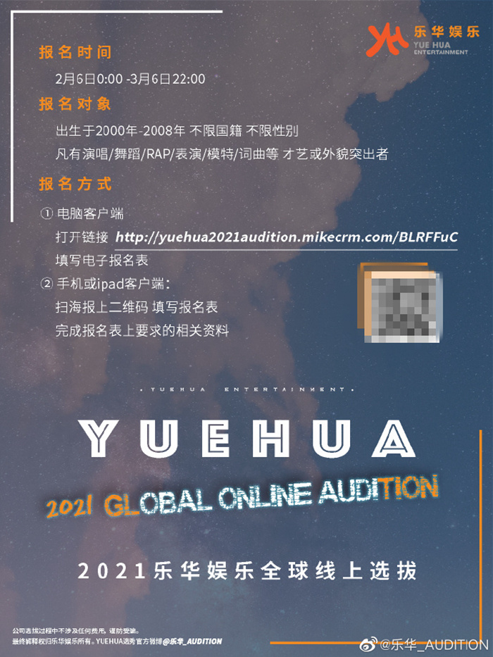 樂華娛樂2月發布的選拔信息顯示,報名者須為2000年-2008年出生者,擁有演唱、舞蹈、RAP、表演、模特、詞曲等才藝之一或者外貌突出者。