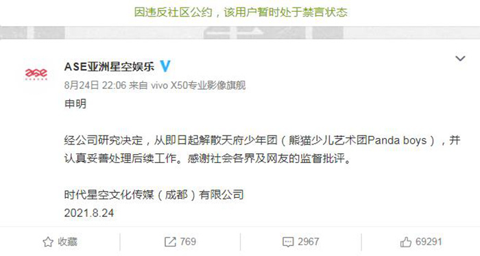 經紀公司ASE亞洲星空娛樂曾回應稱,不是把孩子當作賺錢的工具,而是在孵化具有時代意義的新一代少年榜樣。幾天后,公司再度表示“不做飯圈文化,沒有資本運作”,并將“天府少年團”更名為“熊貓少兒藝術團Panda Boys”。