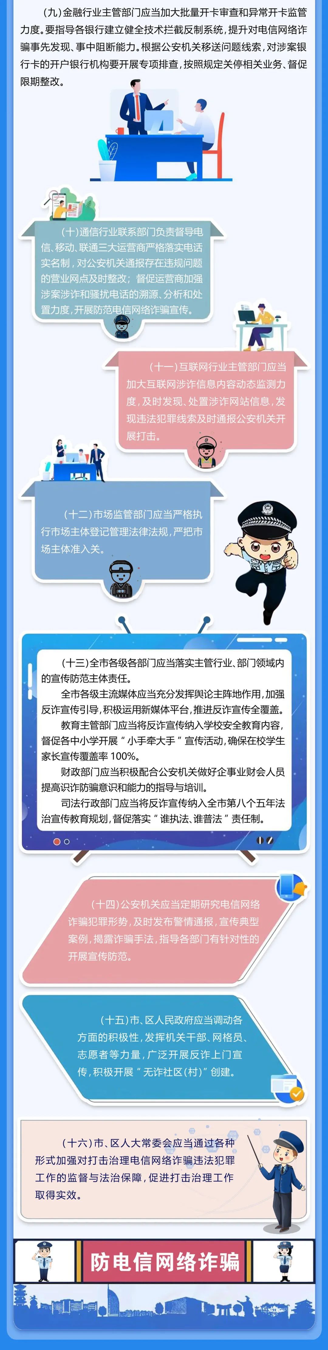 要求市、區人民政府將打擊治理電信網絡詐騙違法犯罪工作作為依法治國、平安建設的重要內容,健全市、區兩級聯席會議制度,建強市、區反電信網絡詐騙中心,堅持黨委領導、政府主導、公安主打、部門主管、行業主責、全社會參與的打擊治理電信網絡詐騙違法犯罪的長效工作機制,努力形成打擊治理電信網絡詐騙犯罪合力。