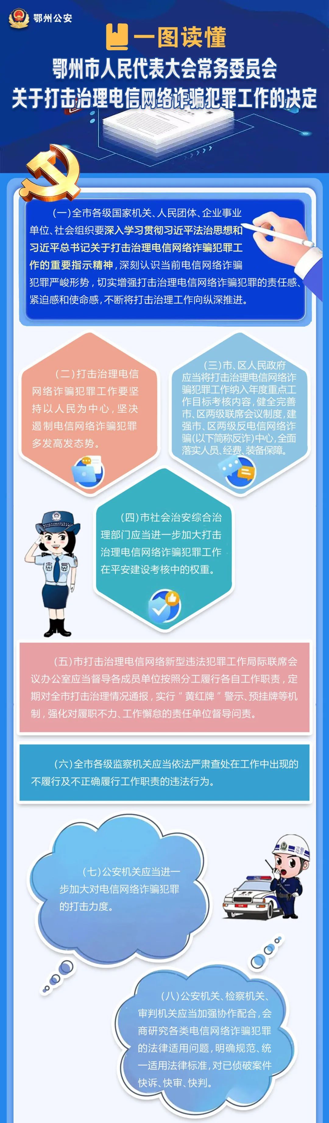 《決定》明確要求全市各級國家機關、企事業單位、人民團體、社會組織要不斷提高政治判斷力、政治領悟力、政治執行力,深刻認識當前電信網絡詐騙犯罪形勢的嚴峻復雜性,進一步增強打擊治理電信網絡詐騙犯罪工作的責任感、使命感、緊迫感;圍繞打防結合、以防為先,堅持源頭治理、綜合治理、精準宣防等措施,最大限度預防和減少電信網絡詐騙犯罪案件的發生;