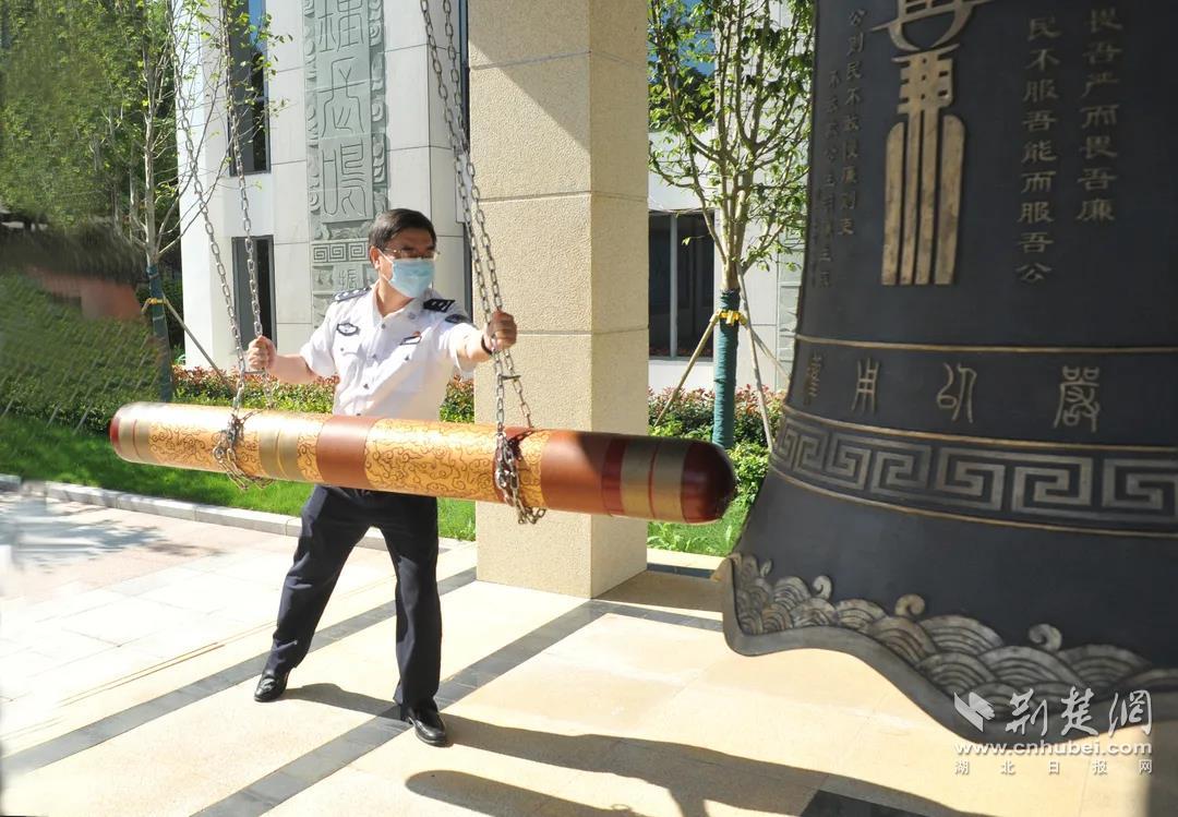 在廉政廣場(chǎng)上,全體民警分兩批整齊列隊(duì)在警示鐘前,賈石松拉開鐘錘,莊重敲響三下廉政警鐘,鐘聲入耳入心、振聾發(fā)聵。