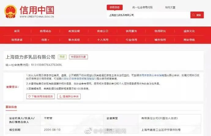 據(jù)信用中國網(wǎng)站消息,近日,養(yǎng)樂多關聯(lián)公司上海益力多乳品有限公司被罰款45萬元。