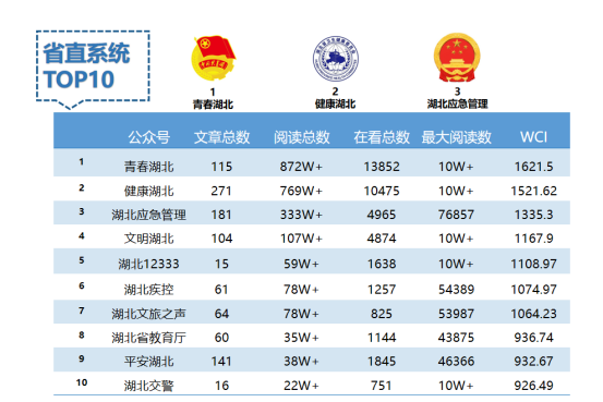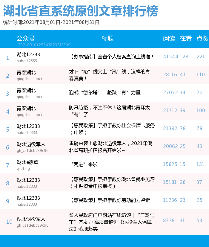 另外,8月湖北省直微信有61篇10萬+文章,其中“青春湖北”52篇、“健康湖北”4篇、“湖北12333”2篇、“湖北殘聯”“文明湖北”“湖北交警”各1篇,數量是上期(29篇)的兩倍多,上漲態勢喜人。