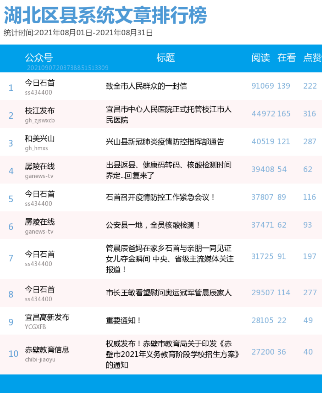 一是內(nèi)容緊扣時(shí)下關(guān)注的熱點(diǎn),8月全省疫情防控進(jìn)入非常時(shí)期,公眾高度關(guān)注疫情防控等相關(guān)信息,前五名的文章有四篇都與疫情防控相關(guān)。8月2日石首市新冠肺炎防控指揮部發(fā)布《致全市人民群眾的一封信》,“和美興山”的《興山縣新冠肺炎疫情防控指揮部通告》以官方名義向群眾說(shuō)明當(dāng)時(shí)的疫情形勢(shì)及防控提醒,讓民眾及時(shí)了解疫情最新信息,給公眾讓吃下定心丸,避免恐慌;二是內(nèi)容切合市民關(guān)注熱點(diǎn),“孱陵在線”的《出縣返縣 健康碼轉(zhuǎn)碼 核酸檢測(cè)時(shí)間界定-回復(fù)來(lái)了》和《公安縣一地全員核酸檢測(cè)》切合當(dāng)時(shí)民眾最為關(guān)心的健康碼轉(zhuǎn)碼及核酸檢測(cè),因關(guān)系到民眾的切身利益,文章紛紛被市民關(guān)注并轉(zhuǎn)發(fā)。三是醫(yī)療資源始終受到市民關(guān)注。“枝江發(fā)布”的《宜昌市人民醫(yī)院正式托管枝江市人民醫(yī)院》標(biāo)題直指民眾核心需求,推進(jìn)優(yōu)質(zhì)醫(yī)療資源下沉,為地方醫(yī)療注入強(qiáng)大動(dòng)能,此類信息關(guān)注度較高。