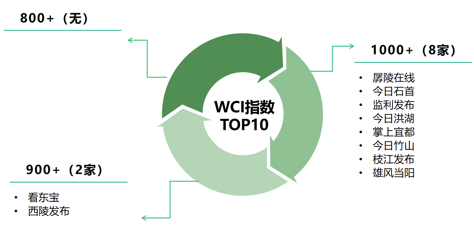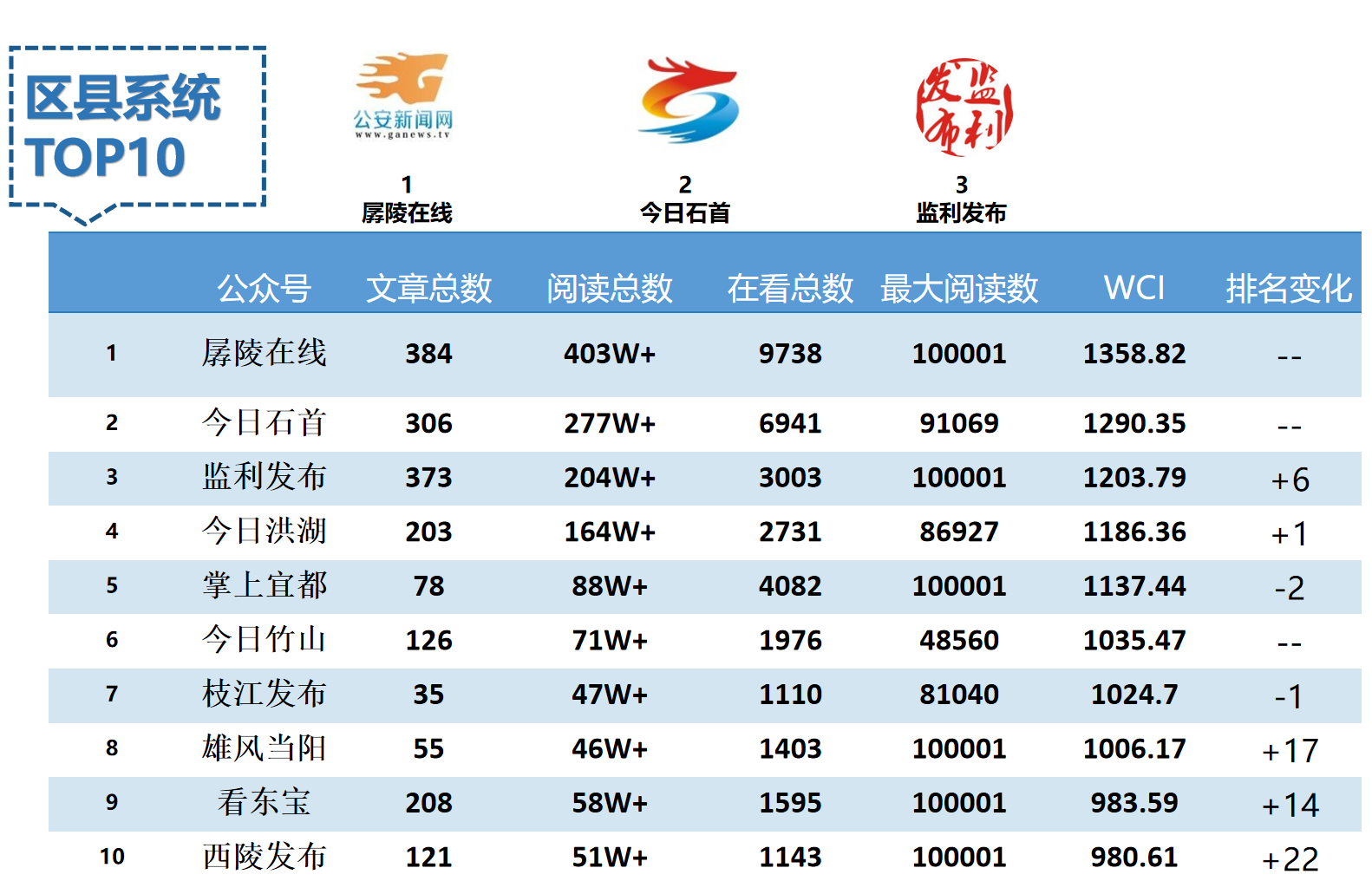 從WCI指數(shù)來(lái)看,本期上榜單位WCI值整體較7月得分上升。上榜賬號(hào)WCI值均在900以上,其中1000以上的有8個(gè),900-1000區(qū)間的也有2個(gè)。“孱陵在線”WCI排第一,主要是因?yàn)殚喿x總數(shù)、文章總數(shù)、點(diǎn)贊總數(shù)遙遙領(lǐng)先,且有一篇閱讀量10W+的文章;“今日石首”表現(xiàn)良好,文章總數(shù)、閱讀總數(shù)、在看總數(shù)都是排在第二位;“監(jiān)利發(fā)布”WCI排第三名,主要是因?yàn)槠鋀CI增量排第一,達(dá)到304.44,文章總數(shù)僅次于“孱陵在線”,且有三篇文章閱讀量10W+。另外,“今日洪湖”其平均閱讀數(shù)均超過(guò)前三名,達(dá)到4933,但WCI增量不如“監(jiān)利發(fā)布”,且在看總數(shù)等指標(biāo)與榜單前三甲存在差距,導(dǎo)致其未能躋身榜單前三。