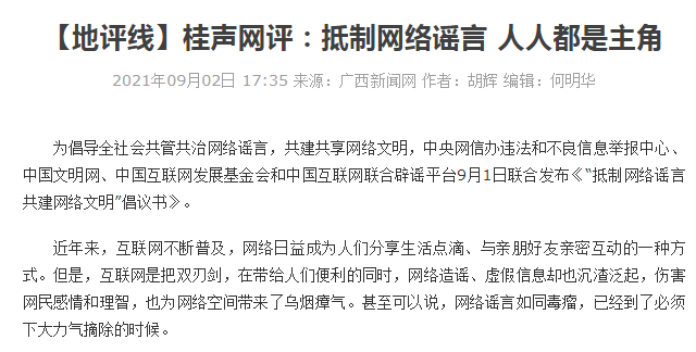 廣西新聞網以《抵制網絡謠言 人人都是主角》為題,強調身為新時代的網民,應該 從“我”做起,提升網絡媒介素養、科學精神和法治意識,不造謠、不信謠、不傳謠,形成抵制謠言的最強合力。