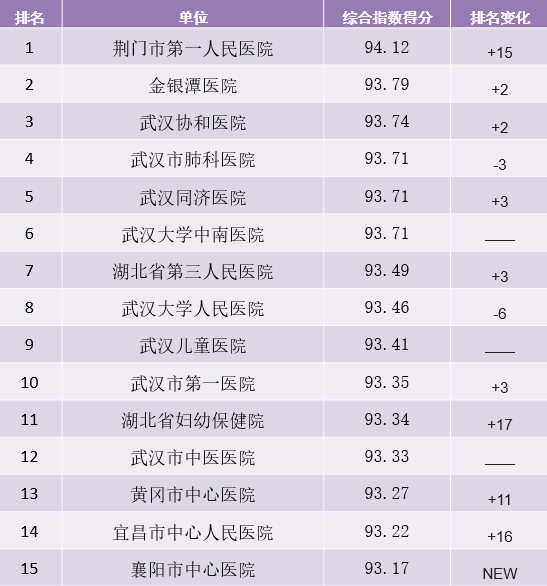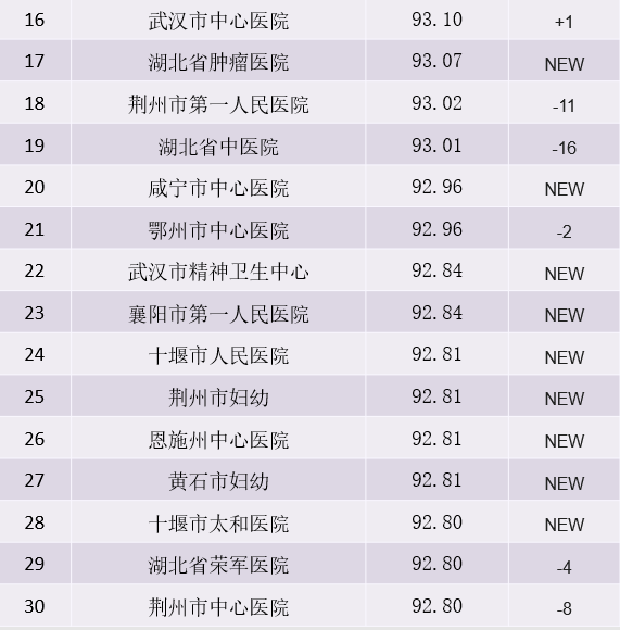 本階段,榜單變動(dòng)較大。具體如荊門市第一人民醫(yī)院成黑馬取得冠軍寶座,較上半月上升15名;第二、三名分別為武漢市金銀潭醫(yī)院和武漢協(xié)和醫(yī)院,兩家醫(yī)院均較上半月上升兩名。新晉10家單位中,襄陽(yáng)市中心醫(yī)院、湖北省腫瘤醫(yī)院、咸寧市中心醫(yī)院進(jìn)入前20名。排名變動(dòng)在10位以上的單位有4家,荊門市第一人民醫(yī)院上升15位,湖北省婦幼保健院上升17位,黃岡市中心醫(yī)院上升11位,宜昌市中心人民醫(yī)院上升16位。武漢同濟(jì)醫(yī)院、湖北省第三人民醫(yī)院排位均上升3位。荊州市第一人民醫(yī)院等醫(yī)院位次大幅下降,溯源發(fā)現(xiàn),排名下滑主因?yàn)槊襟w報(bào)道量減少,后續(xù)可從醫(yī)院治療案例等方面加強(qiáng)宣傳力度,仍有較大上升空間。