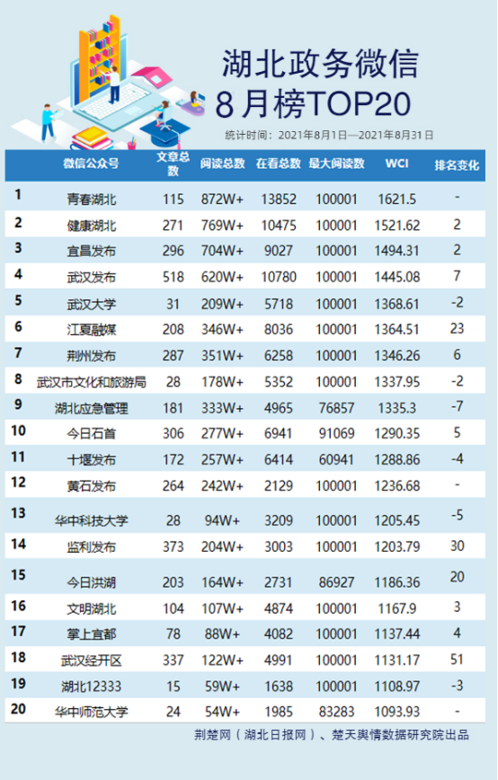 8月WCI指數(shù)前二十榜單中,“青春湖北”仍居第一,“健康湖北”穩(wěn)中有進(jìn),升至第二,“宜昌發(fā)布”時(shí)隔七個(gè)月重回前三。“武漢大學(xué)”跌出前三,排名第四。總體來(lái)看,無(wú)論是發(fā)文總數(shù)、閱讀總數(shù)、在看總數(shù)、點(diǎn)贊總數(shù)、WCI指數(shù)等各項(xiàng)主要指標(biāo),還是閱讀量10萬(wàn)+文章數(shù)的單項(xiàng)指標(biāo),本期均維持住了上漲趨勢(shì)。閱讀總數(shù)和10萬(wàn)+文章數(shù)成倍增長(zhǎng),部分賬號(hào)數(shù)據(jù)成三倍增長(zhǎng)。