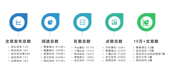 在看總數(shù)本期前五名賬號(hào)中,前四名與上期保持不變,僅第五位發(fā)生較小變動(dòng)。“平安黃岡”仍居第一,“十堰長(zhǎng)安”“鄂州疾控”“青春湖北”分別位居第二、第三、第四,“武漢發(fā)布”取代“健康湖北”躋入前五。點(diǎn)贊總數(shù)10萬(wàn)+的“平安黃岡”獲得點(diǎn)贊總數(shù)冠軍,“青春湖北”“十堰長(zhǎng)安”“武漢發(fā)布”“宜昌發(fā)布”緊隨其后,“武漢大學(xué)”跌出前五。“青春湖北”閱讀數(shù)超過(guò)10萬(wàn)次的文章共有52篇,“武漢發(fā)布”有10篇,“武漢市文化和旅游局”有7篇,“武漢大學(xué)”和“荊州發(fā)布”各有5篇。