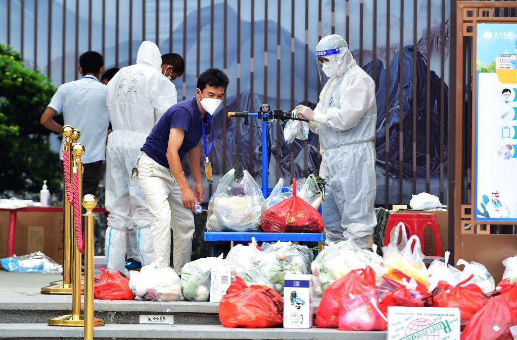 9月22日,莆田仙游縣鯉南鎮富力院士廷小區物業人員在分揀居民采購的生活物資。新華社記者 魏培全 攝