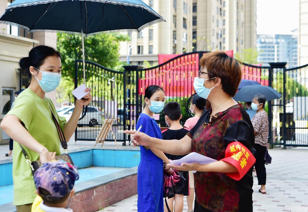 9月17日,莆田仙游縣城內社區的黨員志愿者(前右一)給社區居民登記預約核酸檢測。新華社記者 魏培全 攝
