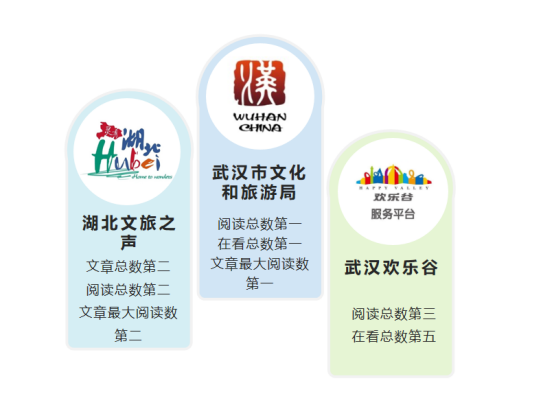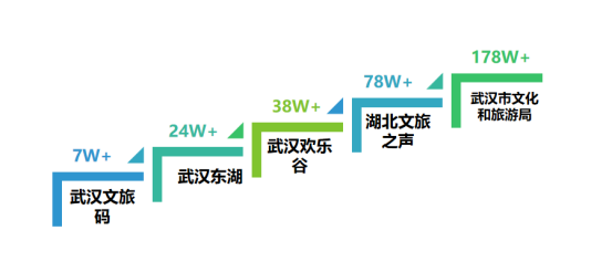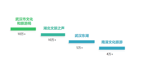 從文章閱讀總數(shù)來看,本期前兩名閱讀量表現(xiàn)亮眼,“武漢市文化和旅游局”該項(xiàng)指標(biāo)為178萬+,較7月增加了54萬+;“湖北文旅之聲”為78萬+,較上月增加24萬+;“武漢歡樂谷”本期閱讀量38萬+,與上期基本持平,“武漢東湖”本期閱讀量24萬+(上期11萬+)??偟膩碚f,本期前四名都超過10萬,第五名“武漢文旅碼”不到8萬,和上期基本一致。