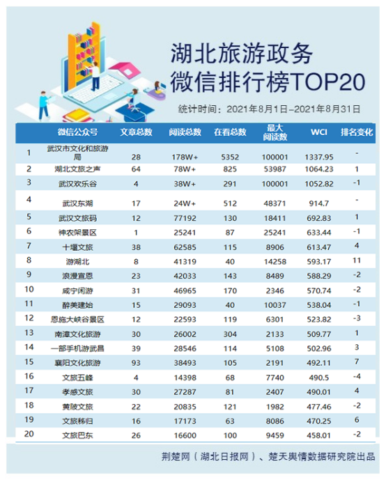 8月,因疫情原因,網(wǎng)民普遍關(guān)注各地最新封控動態(tài),尤其是交通出行、文旅行業(yè)相關(guān)措施。9月24日,由荊楚網(wǎng)(湖北日報(bào)網(wǎng))、楚天輿情數(shù)據(jù)研究院制作的8月旅游行業(yè)政務(wù)微信榜單發(fā)布,“武漢市文化和旅游局”WCI指數(shù)蟬聯(lián)榜首,“湖北文旅之聲”和“武漢歡樂谷”排位互換,分別位居第二和第三;8月原創(chuàng)文章排行榜前17名由“武漢市文化和旅游局”包攬,18-20名均來自于“武漢東湖”。