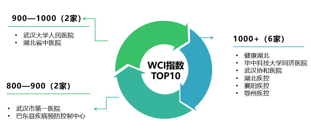 從WCI指數來看,本期TOP10賬號WCI值整體變化不大,得分超過1000+的賬號有6家,分別是“健康湖北”“華中科技大學同濟醫院”“武漢協和醫院”“湖北疾控”“襄陽疾控”“鄂州疾控”,主要得益于閱讀總數、最大閱讀數與點贊總數較高;“武漢大學人民醫院”和“湖北省中醫院”兩家醫院排在900-1000區間;800-900分值區間的有2家。整體來看,WCI增量大部分上升,“湖北疾控”WCI增量排第一,達1074.97,成為進步最明顯的單位。