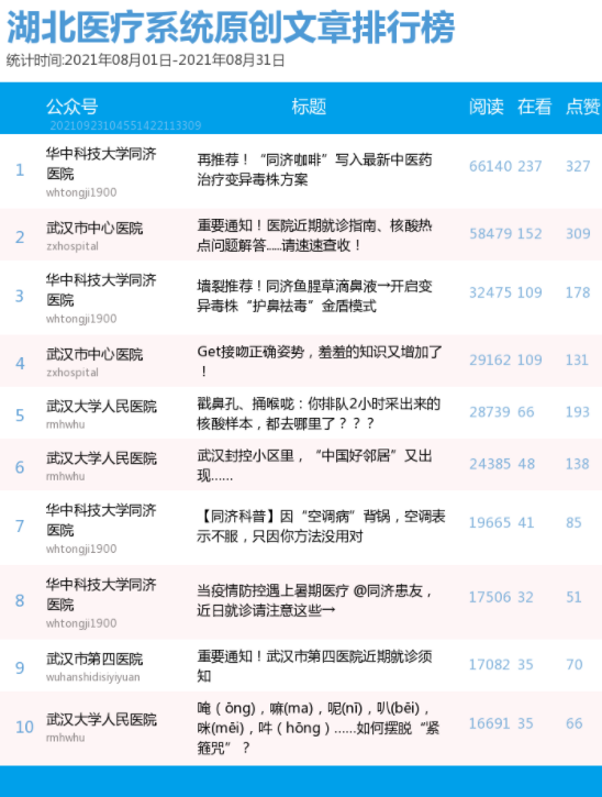 從內容生產方面來看,因8月份受到湖北疫情防控形勢升級影響,涉新冠病毒、核酸檢測等疫情防控領域的文章備受關注,TOP10稿件中,有6篇與疫情防控相關。其中《再推薦 “同濟咖啡”寫入最新中醫藥治療變異毒株方案》標題吸睛且切合時下民眾關切熱點,足夠吸引讀者關注閱讀,該文章獲得66140次的閱讀量;科普文章一直受民眾喜愛,點擊率高,本次上榜的兩篇科普文章分別是“武漢市中心醫院”的《Get接吻正確姿勢,羞羞的知識又增加了!》和“華中科技大學同濟醫院”的《因“空調病”背鍋,空調表示不服,只因你方法沒用對》。