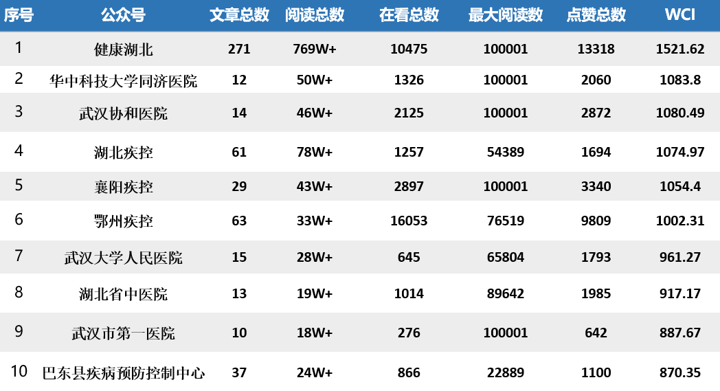 本期榜單各項指數與上期相比基本持平。“健康湖北”以文章總數第一、閱讀總數第一穩坐榜首。上期未進入前十的“湖北疾控”成績不俗,以WCI增量排第一殺回榜單,排名第四;“武漢市第一醫院”以最大閱讀數第一、平均閱讀數增量第三、超10萬的文章數第三重回榜單?!拔錆h市中心醫院”“宜昌市中心人民醫院”2家單位跌出榜單。