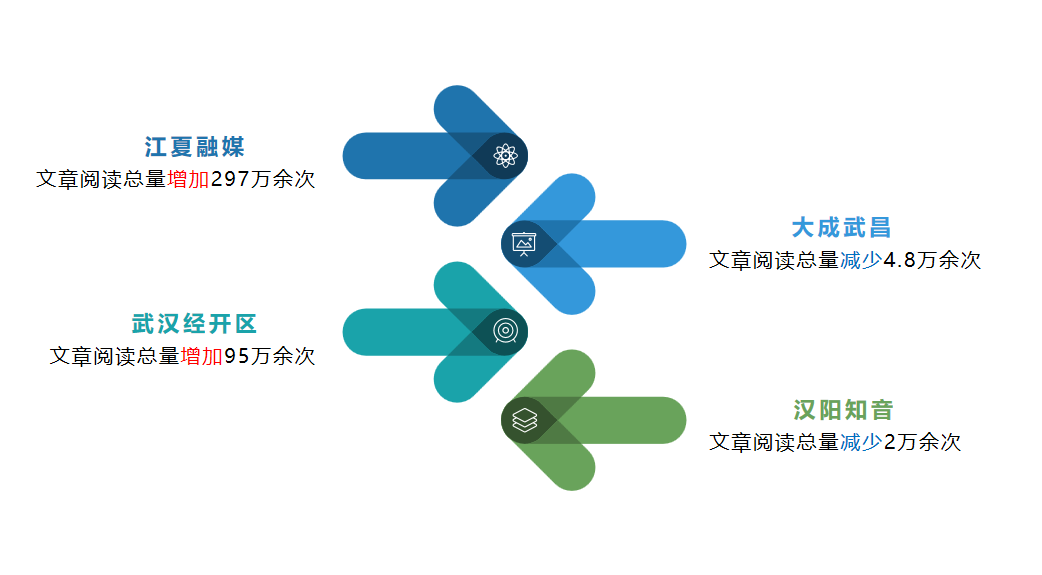 本月上榜賬號中,除“漢陽知音”、“大成武昌”閱讀總量下降外,其他13家賬號閱讀總量明顯上升,前12名均突破十萬,頭部賬號甚至突破百萬。閱讀總量增長排名前列的有江夏融媒、武漢經開區等,江夏融媒增長約達300萬,武漢經開區增長約達100萬,增長量達40萬的有“中國光谷”、“武漢臨空巷”,增長量約30萬的有“蔡甸新聞”“新洲發布”,增長量在10-20萬之間的有“武漢東湖”“美麗青山”“蔡甸之音”,增長量10萬以下的有“洪山大學城”、“大江金岸”、“硚口發布”“幸福黃陂”。在下降狀況中,“大成武昌”閱讀量下降近5萬,是下降最多的賬號,直接導致了WCI得分較大下滑,此外,“漢陽知音”閱讀量下降近2萬。綜上,8月各家賬號閱讀量增長勢頭明顯,成績亮眼,需發揚優勢,保證賬號長期穩定向好發展。