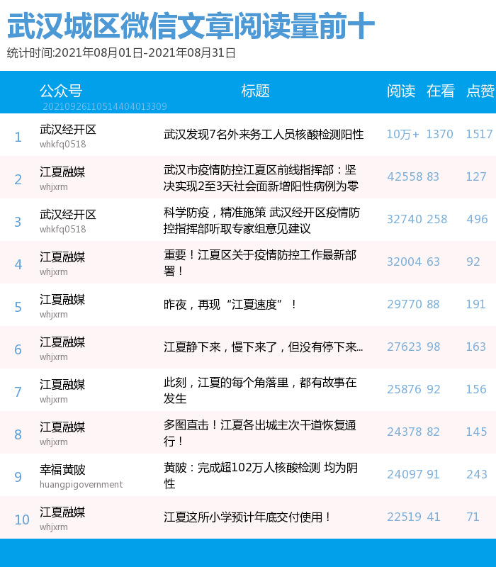 本期微信文章閱讀量前十榜中,“江夏融媒”獨占鰲頭,共7篇文章上榜,“武漢經開區”有2篇文章上榜,“幸福黃陂”本期發力有一篇文章入圍前十。閱讀量排名第一的文章出自“武漢經開區”,閱讀數達10W+,其內容為武漢經開區發布的疫情通報:發現7名外來務工人員核酸檢測陽性。在防疫常態化的總體背景下,疫情通報一直是受眾關注的重點領域,因此即便是通報,閱讀量也達到了最高。除《江夏這所小學預計年底交付使用!》文章外,其他8篇也均與疫情防控有關,主要包括與群眾生命健康、生活安全息息相關的防疫部署、核酸檢測、封控管理等內容,因此備受關注。
