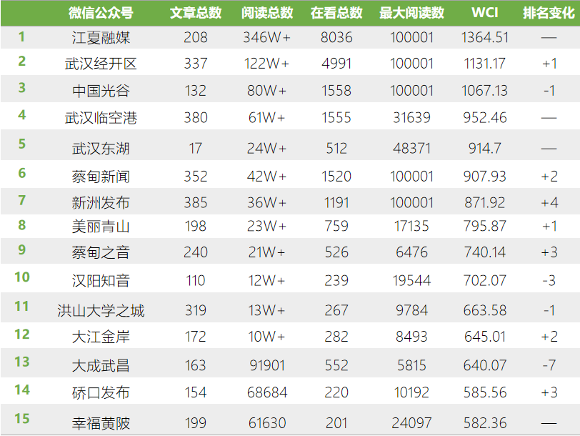 9月26日,由荊楚網(湖北日報網)、楚天輿情數據研究院制作的武漢城區政務微信8月排行榜發布。本期榜單排名前三甲的是“江夏融媒”“武漢經開區”“中國光谷”,WCI均突破1000。冠軍“江夏融媒”與上期排名保持一致,WCI是1364.51,較上期959.23上升明顯;亞軍和季軍本期對調,“武漢經開區”上期排名第三,本期上升一位;季軍“中國光谷”上期排名第二,本期下降一位。