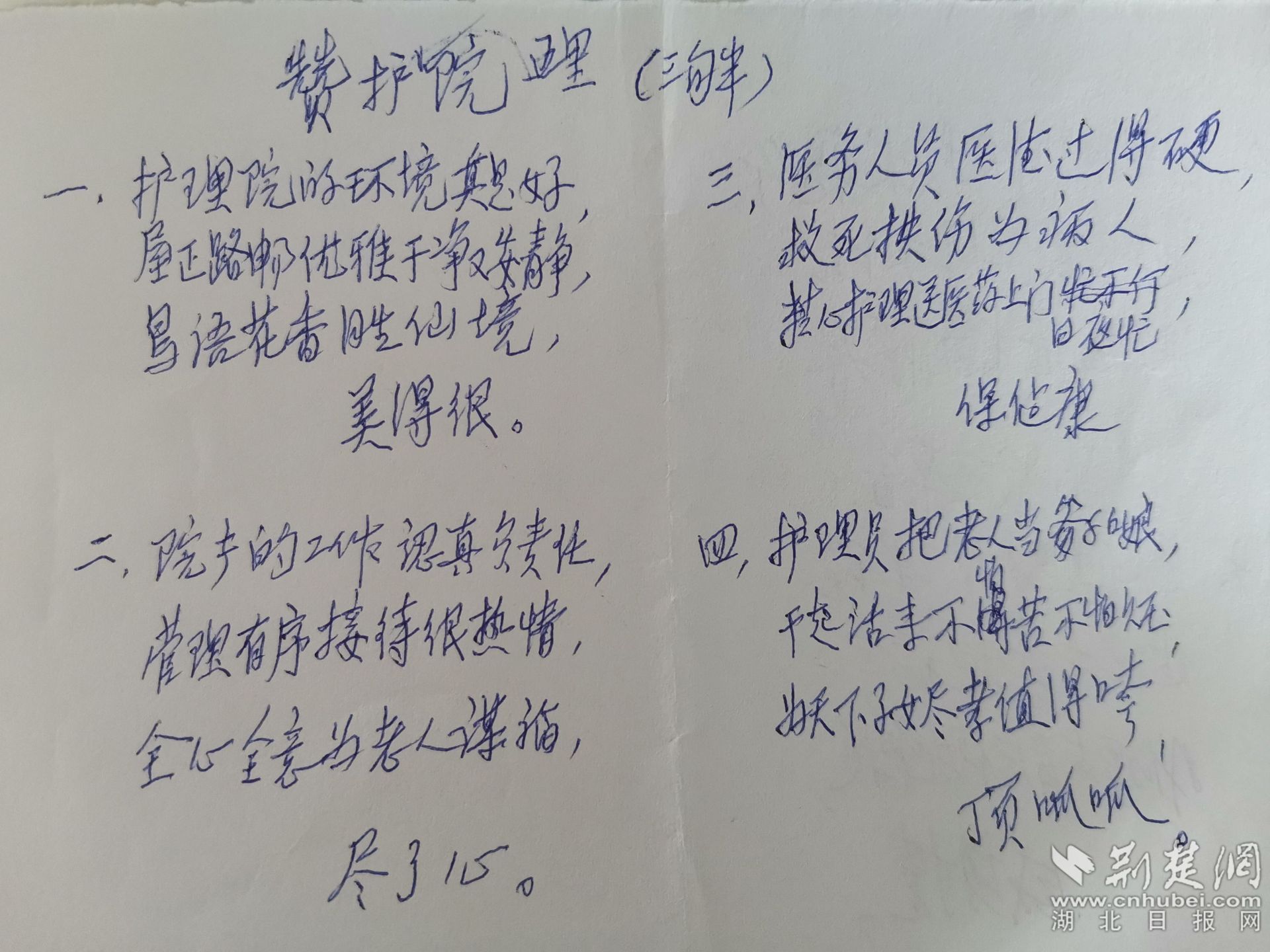 87歲的熊光榮奶奶告訴記者,護理院不僅給老人溫馨的家園,更是對老人奉若父母,照顧護理細心,給予她們勝似子女的關懷,還經常溝通問候。
