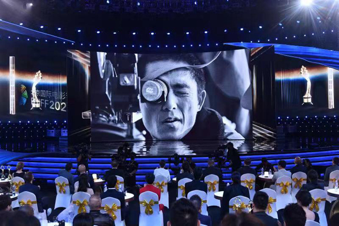 頒獎典禮結(jié)束前,現(xiàn)場還播放了一段中國電影人引領(lǐng)中國電影走向國際的經(jīng)典圖集,包括鞏俐、姜文、葛優(yōu)、劉曉慶、張藝謀等人的照片,現(xiàn)場掌聲不斷。