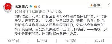 其實早在2015年9月3日,陜西省西安市司法局官方微博“@法治西安”就曾科普過:“只要不是帶有惡意,用國旗做頭像并不違法。”