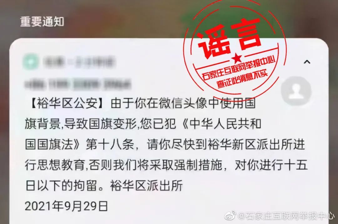 據@石家莊互聯網舉報中心 近日,不少網民收到“由于你在微信頭像中使用國旗背景,導致國旗變形,您已犯《中華人民共和國國旗法》第十八條,請你盡快到裕華新區派出所進行思想教育,否則我們將采取強制措施,對你進行十五日以下的拘留。”的信息,落款是裕華區派出所。