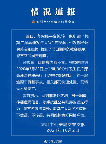 廣東省深圳市公安局交警支隊官方微博10月2日通報,近日,網傳“假期廣深高速發生大火”視頻,經查,為不實信息,視頻內容系2020年發生的一起油罐車側翻事故。