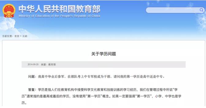 2014年8月,教育部在“我高中畢業后參軍,在部隊考上中專軍校成為干部,請問我的第一學歷是高中還是中專”的提問中回復:學歷是指人們在教育機構中接受科學文化教育和技能訓練的學習經歷,我們在管理過程中所說“學歷”通常指的是最高或最后的學歷,沒有使用“第一學歷”概念。如果一定要強調“第一學歷”,小學、中學也是學歷。