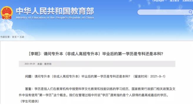 近日,教育部針對網友提問“專升本(非成人高招專升本)畢業后的第一學歷是專科還是本科”進行答復。
