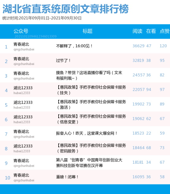 9月湖北省直微信有39篇10萬+文章,其中“青春湖北”以36篇的壓倒性優勢“開掛”,其他3篇分別是“湖北12333”2篇、“文明湖北”1篇。10萬+文章數量較上期61篇的超常發揮相比,有所下降,但與其他月份相比,依舊算較高水準。