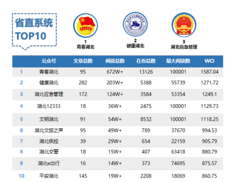 9月,WCI指數排名前三的是“青春湖北”“健康湖北”和“湖北應急管理”。“湖北e出行”沖入前十,“湖北省教育廳”遺憾落榜。相較上期,“湖北12333”與“文明湖北”名次對調,本期名次分別為第四、五名;“湖北文旅之聲”與“湖北疾控”名次對調,本期名次分別為第六、七名;“湖北交警”上漲2個名次,位列第八;“平安湖北”下降1個名次,位列第十。“青春湖北”發文數量雖不占優勢,但在總閱讀數、總在看數、總點贊數上明顯領先其他賬號,穩居WCI指數第一位置。