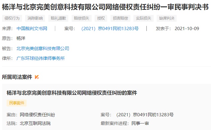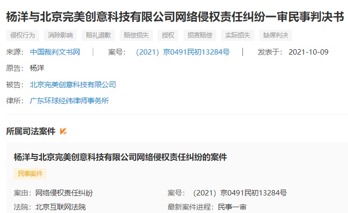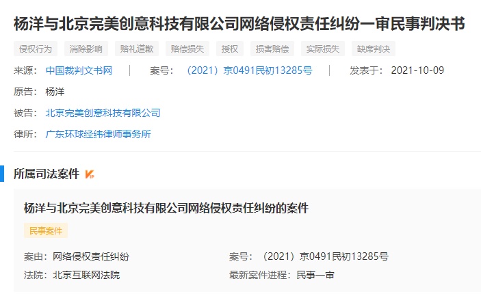 中國經濟網北京10月12日訊 (記者 何瀟 馬先震)近日,中國經濟網記者在企查查看到,10月9日,中國裁判文書網公開了三份楊洋與北京完美創意科技有限公司網絡侵權責任糾紛一審民事判決書((2021)京0491民初13283號、(2021)京0491民初13284號、(2021)京0491民初13285號)。