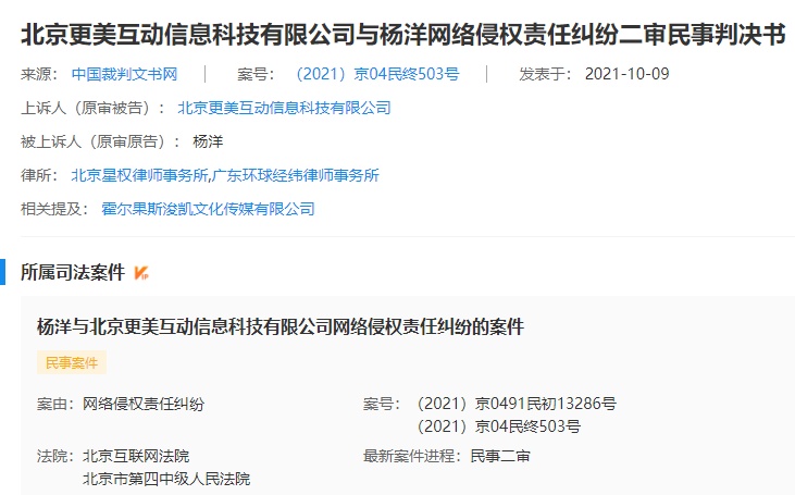 同日,中國裁判文書網還公開了北京更美互動信息科技有限公司(以下簡稱北京更美互動公司)與楊洋網絡侵權責任糾紛二審民事判決書。