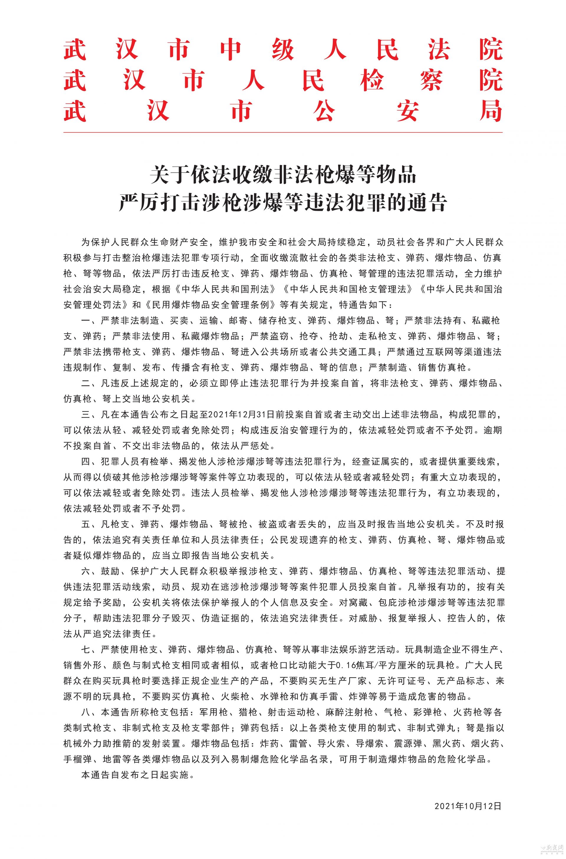 荊楚網(湖北日報網)訊(記者張揚)記者日前獲悉,10月12日,武漢市中級人民法院、市人民檢察院、市公安局聯合發布《關于依法收繳非法槍爆等物品嚴厲打擊涉槍涉爆等違法犯罪的通告》。