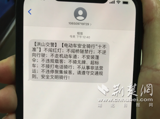 荊楚網(湖北日報網)訊(記者張揚 通訊員崔彥偉 黃一燕)“不闖紅燈、不闖橋隧禁行、不逆向行駛……洪山交警提醒您:請遵守交通規則,安全文明騎行!”10月15日中午,剛為新購買的電動自行車上好車牌的朱女士,便收到了一條電動車交通安全提示短信。