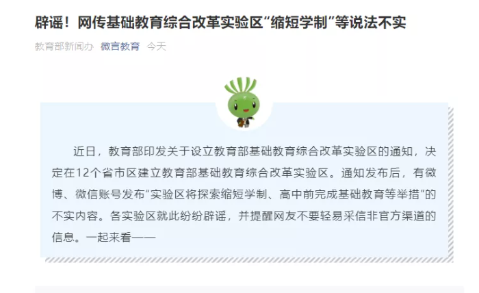 網(wǎng)傳基礎(chǔ)教育綜合改革實(shí)驗(yàn)區(qū)“縮短學(xué)制”等說(shuō)法不實(shí)↓↓↓