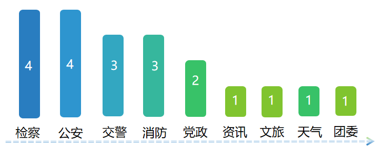從領域分布來看,本期檢察系統、公安系統均有4家單位入圍,涉及省直、武漢、襄陽、隨州、咸寧、十堰等地。消防、交警系統政務微博均有3家單位入圍。黨政領域有2家單位上榜。資訊、文旅、天氣、團委等領域均有1家單位入圍前20榜單。