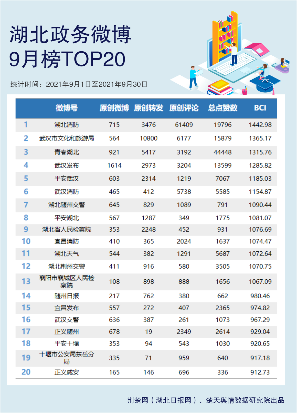 10月19日,由荊楚網(湖北日報網)、楚天輿情數據研究院制作的湖北政務微博9月榜發布。本期榜單由@湖北消防 獲得第一名,第二、第三名分別由@武漢市文化和旅游局 與@青春湖北 奪得。