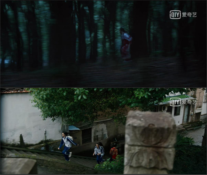 《八角亭謎霧》發生在江南水鄉,開播的第一集,先上演了兩段追逐戲:一個穿著紅色校服的女孩正在樹林里奔跑、高中生玄念玫正在被小混混滿城追。畫面閃過氤氳水鄉、石板街巷,晃動的手持攝影渲染出陰郁的氣氛。