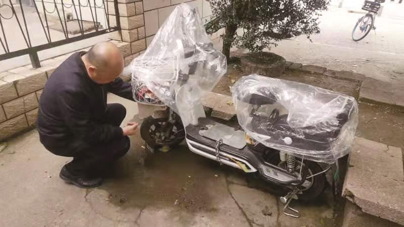 胡永鵬在監(jiān)控中發(fā)現(xiàn),19日晚,天下起了雨,一位路過的婆婆看見這輛電動車一直停在路邊淋雨,就吃力地抬著電動車的后輪,緩慢地將車移到了花壇邊的樹下,還找來兩個大的透明塑料袋,將電動車罩了起來,避免電動車淋雨。