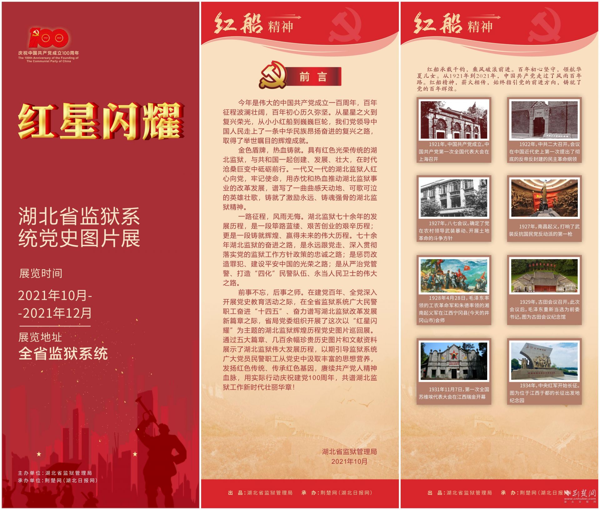 本次圖片展由省監獄管理局主辦,荊楚網(湖北日報網)承辦。展覽以“紅船精神”“紅旗指引”“紅色記憶”“紅心向黨”“紅色傳承”等五大板塊為主線,展示數百余幅相關歷史圖片和文獻資料,生動再現七十余年湖北監獄系統艱苦奮斗、攻堅克難的光輝歷程。